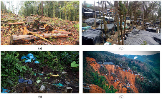 Environmental impacts; (a) vegetation clearing; (b) camp construction; (c) trash contamination; (d) erosion, landslides, and landslides.