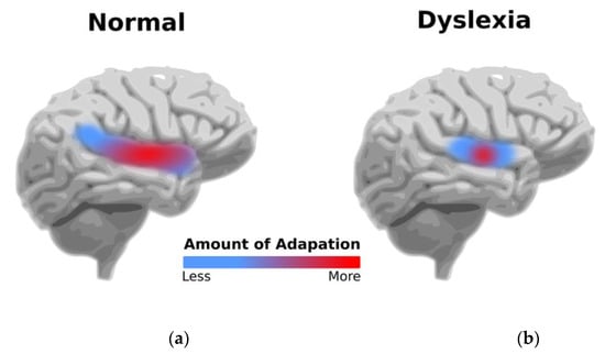 NDD dyslexia is a common type of learning disability, affecting 3 to 15% of school-age children [23]. Individuals with dyslexia have specific impairments in the development of expert reading skills. Dyslexia is characterised by difficulties with correct and/or fluent word recognition and poor spelling and decoding abilities [24]. Individuals with dyslexia have been shown to have differences in functional brain imaging compared to non-dyslexic individuals, for example, reduced neural adaptation to repetitive stimuli [25], as depicted in Figure 2. Children with dyslexia can have other specific learning deficits [24], low self-confidence, anxiety and depression.
