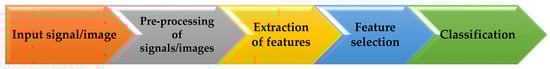 Machine learning forms a part of artificial intelligence (AI) wherein the model is able to do tasks automatically, without needing any human interference. The conventional machine learning models are hence trained by the input data fed to them, after which these models are able to predict outcomes with high accuracies. Deep learning is a subfield of machine learning in which large data is used to train these models, which can also predict outcomes with high accuracies. Both models are commonly used in the diagnosis of some neurological disorders, such as autism [41,42], ADHD [43,44] and depression [45,46,47], with high accuracies. The models are either fed with images obtained from computerised tomography (CT), magnetic resonance imaging (MRI) and positron emission tomography (PET) scans or electroencephalogram (EEG) signals for the diagnosis of neurological disorders. Figure 4 shows the sequence of steps involved in training a machine learning model for diagnosis; after the input of signals or images, pre-processing takes place to clean the data, after which features are extracted and ranked thereafter, to obtain the most significant features, before they are finally classified into normal or abnormal classes. While the feature extraction and selection processes need to be done manually by the researcher for conventional models, these processes are done automatically in deep models.