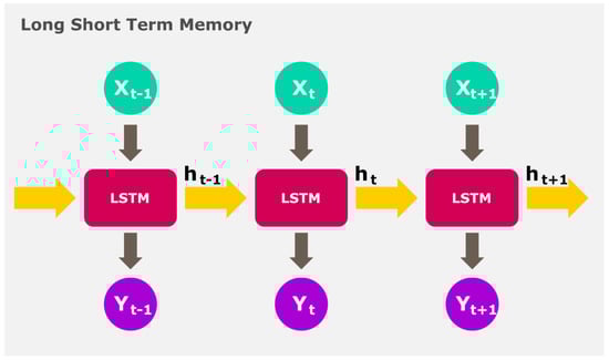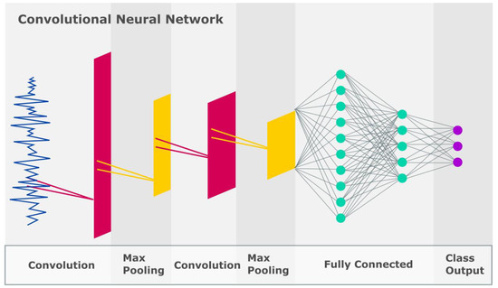 Some frequently used deep models include the convolutional neural network (CNN) [48,49,50], long-short term memory model (LSTM) [51] and autoencoder [52], as depicted in Figure 5, Figure 6 and Figure 7, respectively. In CNN models, the input data is fed to the convolution layer. New feature maps are created in each successive layer wherein more robust features are extracted for forecasting. In the final fully connected layer, the data is classified [48]. The LSTM encompasses three main blocks of memory cells, input, forget and output gates, which are accountable for controlling the information stored, read and written on the cell, respectively, as data comes in [51]. The LSTM principally performs by remembering important information from preceding states and building upon them [51]. Encoders are arranged to form the deeper autoencoder model. Autoencoders perform by encoding unlabelled input data and rebuilding the data accurately thereafter. These models comprise the coding and decoding phases, wherein the same weights are used to encode the feature and rebuild the output [52].