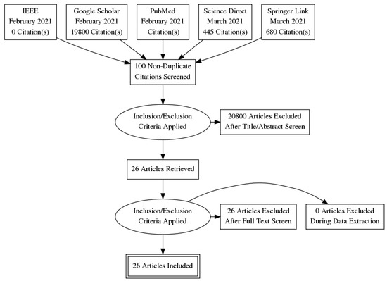 The systematic review was conducted based on the Preferred Reporting Items for Systematic Reviews and Meta Analyses (PRISMA) guidelines to analyse the most relevant studies on assistive tools developed to address learning disabilities using machine learning models. The search was conducted between the years 2011 and 2021. The relevant journal articles were searched through the IEEE, Google Scholar, PubMed, Science Direct and Springer Link scientific repositories, as seen in Table 4. The Boolean search strings such as “machine learning,” “artificial intelligence tools,” “Autism spectrum disorder,” “Attention deficit hyperactivity disorder,” “dyslexia,” “students” and “learning” were used in various combinations. The relevant articles were gleaned from the various databases for this review, based on three primary processes from the PRISMA guidelines. First, a total of 20,926 articles were identified based on the Boolean search strings for autism spectrum disorder, attention deficit hyperactivity disorder and dyslexia. From the IEEE, Google scholar, PubMed, Science Direct and Springer Link repositories, 1, 19, 800, 0, 445 and 680 articles were retrieved, respectively, wherein most articles described the diagnostics/prediction/screening of ASD, ADHD, dyslexia or other neurodevelopmental disorders. Subsequently, articles were screened wherein duplicate and irrelevant articles were excluded based on the inclusion and exclusion criteria. The process culminated with the selection of the most relevant articles, which was set to 26. The flowchart detailing the processes involved in the retrieval of appropriate articles using PRISMA guidelines is shown in Figure 8.