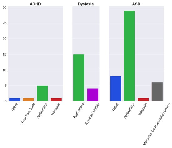 Bar graph representation of various assistive tools used to aid in the learning of ADHD, dyslexia and ASD students.