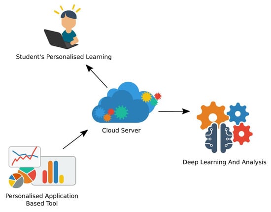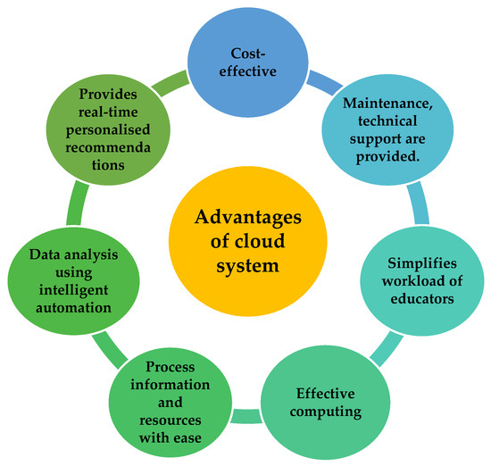 Merging the AI tool in the cloud is beneficial as it is cost-saving, wherein costs related to hardware and maintenance or on-site data centres are eliminated [117]. The AI tool is also able to computerise intricate and repetitive tasks to enhance productivity and perform data analysis using intelligent automation; hence, it does not require any human intervention. The AI-based tool is also able to perform data analysis rapidly and provide deeper insights and hence is competent in offering real-time personalised recommendations to users [117]. AI tools are able to simplify how data is used, modified and handled and thus improve data management when imbedded in cloud systems. AI-powered network security tools need to be used to improve security to protect critical data when imbedded in cloud systems. Using the cloud server is also beneficial as it is part of the internet of things (IoT), where the data on shared networks [118] enables faster and more accurate outcomes. It also optimises equipment and usage of resources [118] that aid in managing situations better, such as being able to develop personalised tools for individuals. The core advantages of using cloud computing in school settings for personalised education are summarised in Figure 11, as seen below.