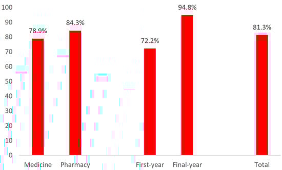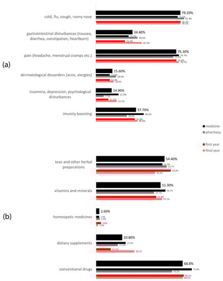In our study, final-year medicine and pharmacy students opted for self-treatment at a significantly higher percentage (94.8%) compared to the first-year students (72.2%), while there was no statistically significant difference between the students of different study programs in terms of self-medication prevalence. The study conducted at the University of Applied Health Studies in Zagreb, Croatia, investigated the attitudes about self-medication for pain relief and features of self-medication in first-year students, and no differences between the six study programs were determined []. Similarly, self-medication prevalence was found to be similar in medicine and pharmacy students in Bangladesh, although pharmacy students were more aware of self-medication risks than medicine students []. In a study conducted in Jordan, pharmacy students practiced self-medication at a higher rate than medicine students (82.9% vs. 74.4%) [].