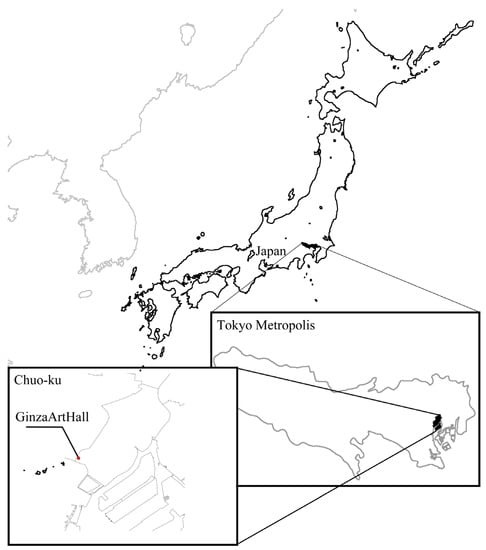 The experiment was conducted over two days, 9 and 10 February 2020, at the Ginza Art Hall (hereafter referred to as art gallery) in the Ginza district of Chuo-ku, Tokyo, which was rented out. During the survey period, a state of emergency was declared for the entire Tokyo metropolitan area owing to the COVID-19 pandemic. Therefore, in line with the “Tokyo Metropolitan Government Guidelines for the Prevention of the Spread of Infectious Diseases,” we ventilated the experimental and waiting room; disinfected the seats with alcohol, as needed; and asked the subjects to wear masks (Figure 1). All subjects were not vaccinated before the study. In addition, a test kit was sent to the subject’s home in advance to check for COVID-19 infection just before the experiment. Although this study, similar to previous studies [7,8], is a case study and a type of study without a control, the experimental protocol was determined by referring to the literature [2,4,5,7,8,10] and by considering the burden on the subjects.