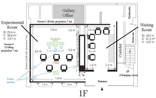 We prepared two rooms for the experiment: a waiting room and an experimental room (Figure 2). In the anteroom (31.3 m2), we explained the experiment to the subjects; requested informed consent, after which they filled in the consent form; and conducted a psychological survey before the digital forest bathing experience. The experimental room (58.8 m2) was set up next to the waiting room and was designed to incorporate elements of the forest environment, focusing on sight, hearing, and smell to create an environment for digital forest bathing. Five projectors (FP-Z5000, FUJIFILM Holdings Corp., Tokyo, Japan) were used to project video images taken in Urahoro-cho, Hokkaido, on the three south–northwest walls and ceiling of the experimental room. Simultaneously, speakers (ICS-15, ONKYO Home Entertainment Corp., Osaka, Japan, one being a woofer) installed at six locations in the room emitted environmental sounds linked to the video images. The environmental sounds were recorded by a sound-collecting microphone at the same time that the video was taken (Insta360 ONE R, Shenzhen Arashi Vision Co., Ltd., Shenzhen, China). In addition, to reconstruct the forest environment of Urahoro-cho to the extent technically feasible, the essential oil of Abies sachalinensis, the main tree species in Urahoro-cho, was put into a diffuser (Orb, AT-AROMA Co., Ltd., Tokyo, Japan) and installed in the experimental room to ensure that the subjects could have an olfactory experience linked to the video. To avoid congestion during the experiment, the number of participating subjects was limited to a maximum of five per session, and the subjects sat facing the west wall, with some distance between them to experience digital forest bathing (Figure 2).