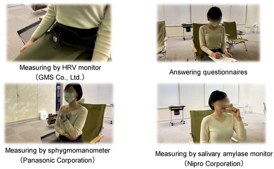 Subsequently, the subjects were immediately moved to the experimental room next to the waiting room. After sitting on the outdoor chair, the subjects were allowed to rest (3 min). After resting, their preliminary physiological survey parameters (maximum blood pressure, minimum blood pressure, pulse rate, and salivary amylase activity) were measured. Values corresponding to these measures were recorded on a sheet by the experimental staff (10 min).