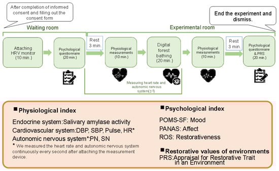 We used seven indicators to evaluate the physiological effects of the digital forest bathing environment on restorativeness. The indicators were classified into those to be compared before and after the experience and those to be measured continuously during the experience. Specifically, four types of physiological indices were assessed before and after the experience of the digital forest bathing environment, and three physiological indices were assessed every s during the experience.