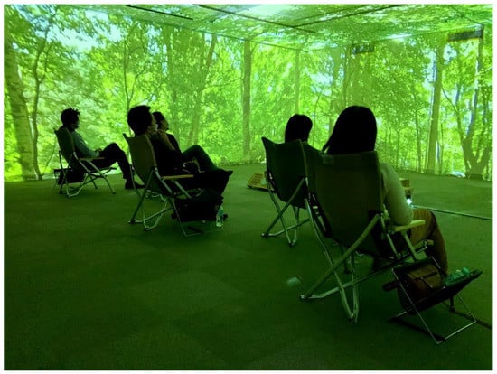 Participating in the environment has been a key point in previous VR-based studies [34,35,36], and head-mounted displays (HMDs) have been used to present high-quality images for improving immersion. However, some people, such as people who are older and who have dementia and children with attention-deficit hyperactivity disorder, do not feel comfortable wearing HMDs. Under such conditions, in any case, most VR users are alone in their experience of nature, for now. They cannot share the natural environment and their experiences with others, which does not satisfy the fundamental human desire to share good experiences with other people. Therefore, if there is an environment or facility where people can share their experiences while solving the problem of wearing an HMD, it will be possible to have an experience that solves the above issues to a large extent. In addition, if such an artificial forest environment and facilities are available, even after the coronavirus pandemic, urban residents who have become physically and psychologically distant from forests in their daily lives can have a more carefree experience of the forest environment than before, which is expected to increase interest in and connection with real nature. The interest in forests nurtured in this way will encourage people to visit actual forests and make more active use of them. Furthermore, if forests are seen again as an integral part of people’s daily lives, it will lead to the proper management of Japan’s forests, which account for 67% of the country’s land area.