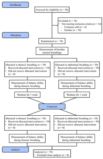 This study followed a randomized crossover design. A CONSORT flow diagram with a crossover design is shown in Figure 1. This study evaluated balance ability in three breathing conditions (neutral breathing [NB], TB, and AB). After baseline (NB) measurements, 78 subjects were randomized to the TB group or AB group using a permuted-block randomization method. Participants received breathing training corresponding to each group. Balance ability was assessed using the trained breathing technique. After a one-week washout period, all participants were trained in the rest of the breathing methods, and their balance ability was assessed using the trained breathing methods. All breathing training was performed by a physical therapist with more than 5 years of clinical experience, and all measurements were conducted by a researcher with more than 5 years of clinical experience and a master’s degree or higher under a blinded condition about group assignment and the intervention.
