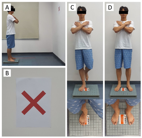 Static balance measurement. (A), Balance measuring environment. (B), X-shaped target. (C), One-legged standing posture. (D), Two-legged standing posture.