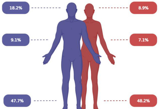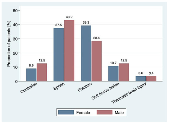 The comparison between genders is presented in Supplementary Table S2. The mode of admission differed significantly between male and female patients. Relatively more females were admitted through ambulance transfer (14.3%) or air ambulance (8.9%) (p = 0.011), whereas male patients were more frequently identified as walk-in patients (57.1%). Fractures were more often observed in females than males, corresponding to 39.3% and 28.4%, respectively (Figure 1), and therefore were triaged as more urgent.