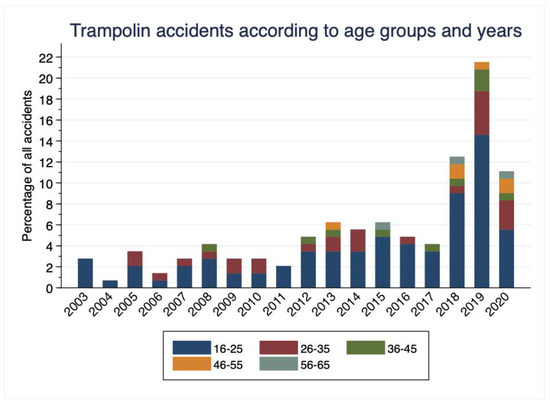 An increase in the total number of trampoline-related injuries was seen in the second study period (between 2012 and 2020; Supplementary Table S3). In the time period from 2003 to 2011, 33 patients were admitted to the emergency department due to a trampolining accident, whereas in the period from 2012 to 2020, 111 patients were admitted (i.e., the gradual increase is shown in Figure 3). The incidence of trampoline-related injuries in patients older than 36 years of age tends to increase from 3% for the period 2003–2011 to 13.2% for the period 2012–2020. A decrease in injuries related to school facilities was observed for the second period of the study (24.2% vs. 14.4%) and was accompanied by an additional increase in indoor recreation halls (i.e., 3% to 12.6%; Supplementary Table S3). Additionally, our data indicated decreasing incidence of fractures and traumatic brain injuries over time. In the two time periods, that is 2003 to 2011 and 2012 to 2020, the percentage decreased from 40% to 29.8% for fractures and from 5% to 2.9% for traumatic brain injuries (one case of incomplete traumatic quadriplegia).