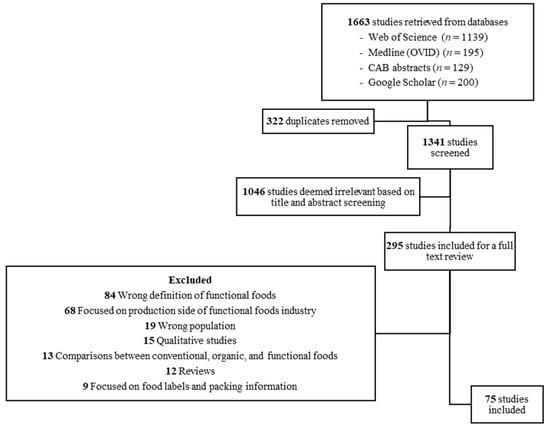 We conducted literature searches in October 2020 using four databases—Web of Science Core Collection, Medline (OVID), CAB abstracts, and Google Scholar. We selected these databases after consulting with a subject librarian. Using these four databases ensured the adequate inclusion of relevant references in our scoping review. We began the search process using Google Scholar, which uses a full-text indexes approach. Therefore, we reviewed the first 200 search results presented by Google Scholar, which the database deemed most relevant based on our search terms. After reviewing these search results from Google Scholar, we determined the search terms and Boolean operators for the other three databases (Web of Science Core Collection, Medline [OVID], and CAB Abstracts). The first set of search terms included “functional food*” OR “functional product*” OR “enriched food*” OR “enriched product*” OR “fortified product*”. The second set of search terms included “consumer accept*” OR “consumer purchase behavior*” OR “consumer attitude*” OR “consumer perception*” OR “consumer willingness to pay” OR “consumer willingness to buy”. Then, we conducted a manual search for several additional studies that we obtained from the reference lists of studies already included. We validated our search process by examining reviews published on similar topics and comparing their included studies and reference lists to ours.