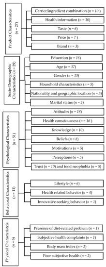 Based on our consensus, the determinants were classified into five categories. The five categories—product characteristics, socio-demographic factors, psychological characteristics, behavioral characteristics, and physical characteristics—are described below. Each of the categories are more fully described by individual determinants (see Figure 3). Consumer acceptance is defined as outcome measurements in our scoping review, which includes general acceptance [], willingness to pay [,], willingness to buy [,], willingness to try [], perceptions of functional foods [,], consumption of functional foods [,], purchase intention [,,,], and choice of functional foods [,,].