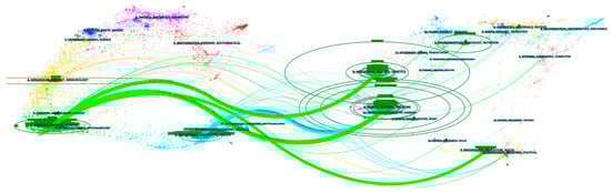 To explore the citing trajectory of the 2282 publications at the discipline level, we used CiteSpace to construct a dual-map overlay of the journals (see Figure 1). Dual-map overlay is a method of portfolio analysis that depicts the sources (citing articles) and targets (cited references) of citations on a science map []. The dual-map base is generally used to make a single source overlay, organizational overlay, and subject matter overlay []. In the current study, the subject overlay showed from which discipline a citation is originated and which target discipline it pointed to. This allowed us to view the interdisciplinary connections of the research from a macro perspective.