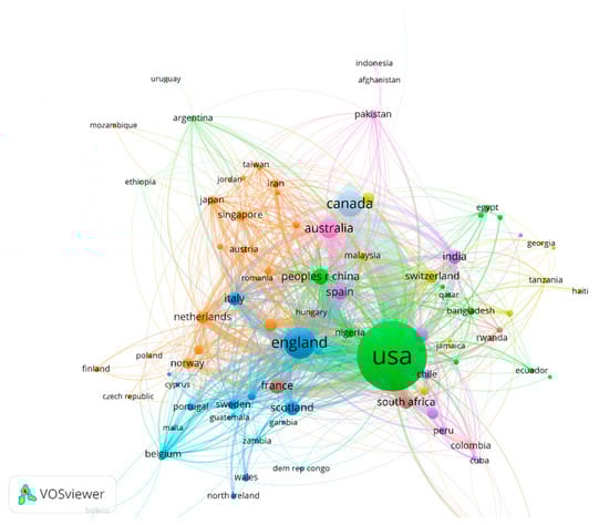 To make the figure more readable, the maximum number of countries per document was set to 25. The normalization (According to the VOSviewer manual, the normalization method is usually “used as input for the VOS layout technique and the VOS clustering technique”. There are three methods to normalize the strength of the links between items, including association strength, fractionalization, and linLog/modularity) method used in this paper was association strength to make the picture more readable. There were 99 countries or regions with strong associations, as evidenced in Figure 2. VOSviewer divided them into 12 clusters according to strength of association, with different colors representing different clusters (see Figure 2). In the cooperation network, the United States was in the core position, and the range of countries or regions that it cooperated with was the widest. This can be observed in Table 3. The USA had the most links and largest total link strength. Meanwhile, England and Canada, respectively, ranked the second and third highest in total link strength. However, the countries in Table 3 are different from the countries in Table 2. Although India and Scotland had the highest ranks in Table 2, they were not shown in Table 3 due to their low cooperation strength.