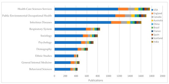 At the same time, by using the top 10 research directions in Table 1 as a classification, we counted the number of publications in these areas for the 10 countries in Table 2, as shown in Figure 3. We found that these 10 countries generally focused on three areas of health disparities research during the COVID-19 pandemic, namely health care sciences and services, public environmental occupational health, and infectious diseases. Because the coronavirus is a type of respiratory disease, the disparity issues that it touches upon are closely related to biological factors in respiratory diseases. COVID-19 is also connected to health disparities that concern psychological, democratic, and other related social issues. In all these areas, the United States was the country with the highest number of publications. Other developed countries or regions accounted for an approximately equal share of the publications in each area. Emerging-market countries accounted for a significantly lower share of the publications in ethnic studies and general internal medicine than in other research areas. This finding may be due to cultural and political differences between countries or regions, which precipitate differences in research directions.