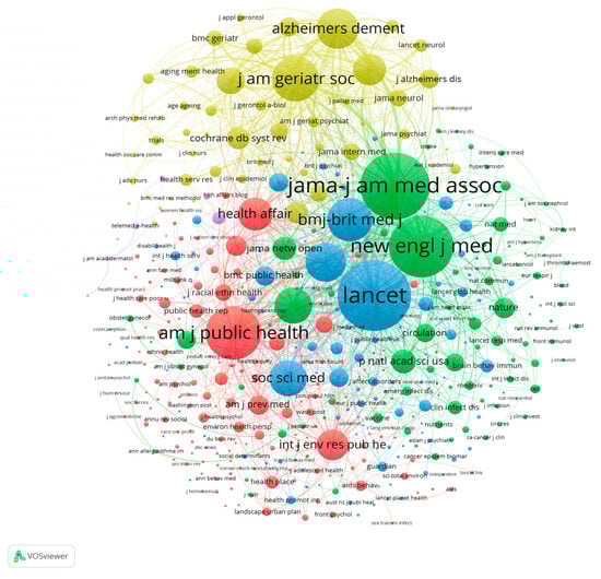 We also analyzed the co-citations of journals. Cited references that were cited by 2282 source articles constituted a journal co-citation network. There were 24,516 source journals for the cited references. In order to obtain readable figure, we chose the journals with more than 20 citations. Then, there were 439 journals meeting the threshold. Finally, we constructed the co-citation networks of these journals and formed five clusters, as shown in Figure 4. Nodes with the same color represent the same cluster. In the green cluster, JAMA—Journal of the American Medical Association and the New England Journal of Medicine occupied the key positions. In the blue cluster, The Lancet and BMJ—British Medical Journal—were in relatively important positions. The American Journal of Public Health, the International Journal of Environmental Research and Public Health, and Health Affairs were central in the red cluster. In the yellow cluster, the Journal of the American Geriatrics Society and Alzheimer’s & Dementia were at the core. These findings indicate that the papers that were published in these journals made important contributions to the study of health disparities and COVID-19.