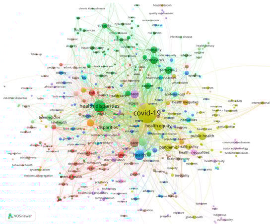 The content of an academic article is distilled into its keywords. Therefore, analyzing co-occurrences of and connections between keywords can reveal trending topics, perspectives, and methods in research. We used VOSviewer to construct a keyword co-occurrence network for COVID-19-related health disparities, as shown in Figure 7. In that figure, keywords from similar categories are depicted in the same color, with 11 clusters in total. The larger a node, the more frequent the occurrence of the keyword that it represents. The lines that link the nodes indicate keyword co-occurrence relationships. “COVID-19” was the keyword with the highest number of occurrences. This is so because the present papers focused on health disparity studies that are related to the COVID-19 epidemic. We extracted the four most important categories of keywords from the 11 clusters, in line with Figure 7.