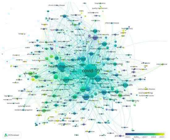 - “Racism”, “ethnicity”, ”race”, and such like. This part of the study focused on different ethnicities or populations as subjects of health disparities research. During the epidemic, COVID-19 outbreaks were concentrated among individuals in high-risk occupations, which usually involve vulnerable groups in society, further exacerbating socioeconomic and social inequalities in health []. Some scholars focused on the US health system. They argued that COVID-19 exposed and exacerbated pre-existing racial inequalities in American society and that it would have a very adverse impact on some minority communities, including black communities, Latino communities, immigrant communities, and Native American communities []. Health disparities between different populations have become the focus of public health policy in the context of the COVID-19 epidemic.