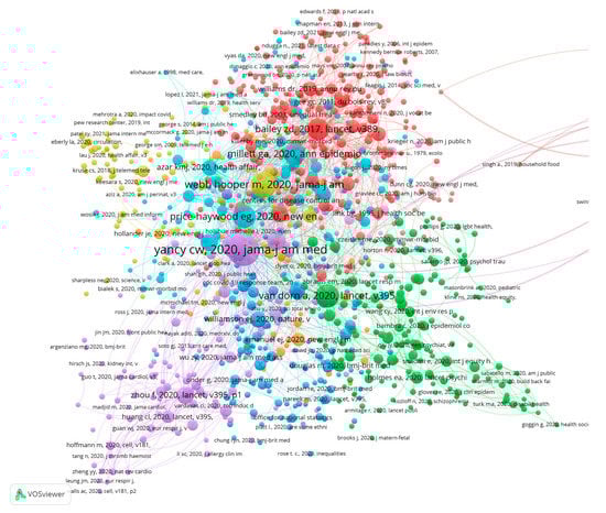 In the purple cluster, co-cited references focused on monitoring or discussing the risk factors of health disparities in patients with COVID-19. For example, these studies consistently monitor and report hospitalization rates, clinical characteristics, and outcomes of hospitalized patients with different ages, genders, races, concomitant comorbidities, and socioeconomic status [,,,,]. The analysis of the factors influencing health disparities under COVID-19 is important for scientific planning and for guiding the effective allocation of health care system resources. Within this cluster, Yancy (2020), published in JAMA-Journal of the American Medical Association, had the highest citation frequency. The article noted that the scourge of COVID-19 has further exacerbated health care disparities []. In the United States, African Americans or blacks are more likely to be infected with COVID-19 and more likely to die. This is partly caused by concomitant comorbidities. On the other hand, it is also due to socioeconomic factors. For example, most blacks live in areas of poverty, with high housing density, high crime rates, and poor access to healthy food. Moreover, policies such as social distancing have an even greater negative impact on the livelihoods of poor people, as they are less able to do their jobs by working from home or telecommuting. As such, Yancy reflected deeply on the risk factors for health disparities during COVID-19 and emphasized that these factors have also persisted throughout history. He suggested the urgent need for public health system changes to address health care disparities []. This clustering is similar to the yellow clustering. However, this cluster focused more on the factors influencing health disparities, while the yellow cluster focused more on interventions for health disparities.