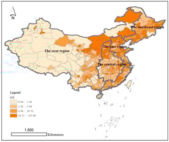 Our research objects were 286 cities in four regions of eastern, western, central, and northeastern China. There are significant spatial differences in regional features, such as the population density, economic activity, and weather conditions among the four regions. The spatial difference of regional economic development level presents a significant step-by-step distribution characteristic. The economic development level decreased from coastal areas to inland areas, with the highest in the eastern region, the second in the central region, and the lowest in the west and northeast regions. The geographical distribution of China’s urban population is uneven, with a densely populated eastern area and sparsely populated western area. This spatial distribution pattern is separated by the ‘Hu Huanyong Line’, an imaginary line that divides China into two parts with roughly equal populations, from Heihe (a northern Chinese city bordering Russia) to Tengchong (a southwestern city bordering China with Myanmar) [53,54]. During the study period, the overall migration of China’s population mainly flowed from the northeast and west regions to the central and eastern regions. In terms of the weather conditions, the southeastern areas at low latitudes have higher temperatures and more precipitation throughout the year, while the northwestern areas are hot and rainy in summer, and cold and dry in winter. The spatial differences of these factors may be somewhat related to the spatial heterogeneity of carbon emissions in China.