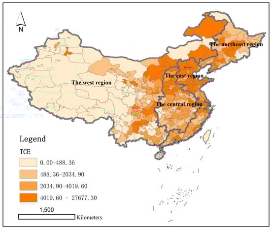 In Equations (3)–(5), Theil is Theil index; n is the number of cities in the sample region; TWR is the differences within the four regional groups of northeast, east, central, and west regions; TBR is the differences between the four regional groups; ndb, nd, nz, and nx are the number of cities within the eastern, eastern, central, and western regions, respectively; Ti is the carbon emission index of region in and the national average ratio; Tdb, Td, Tz, and Tx are the ratios of carbon emission indexes of the northeast, east, central, and west regions to the national average, respectively.