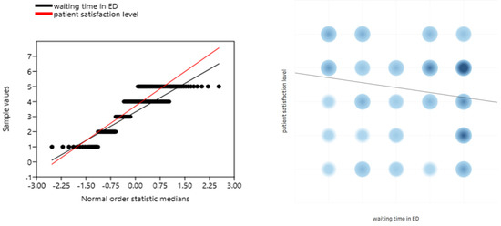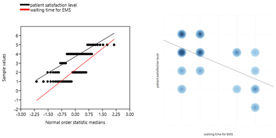 Figure 3). The longer the waiting time, the lower the patient’s satisfaction. A significant relationship was also observed in the correlation of the patient’s place of residence with the level of patient’s satisfaction with the help provided in the ED (r = −0.276;
