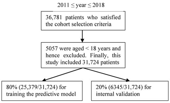 The enterprise data warehouse of the UWM contains the original and uncleaned EHRs and administrative data. To ensure data validity, we implemented a data collection and cleaning process before building the predictive model. We identified patients with asthma in a specific year using a minimum of one diagnosis code of asthma in that year: the International Classification of Diseases, Ninth Revision codes 493.9x, 493.8x, 493.1x, and 493.0x; and the International Classification of Diseases, Tenth Revision codes J45.x [20,42,43]. The patient cohort included 31,724 adult outpatients (age ≥ 18 years) with asthma between 1 January 2011 and 31 December 2018; 5057 outpatients (age < 18 years) were excluded. The distribution of this study’s dataset is presented in Figure 1.