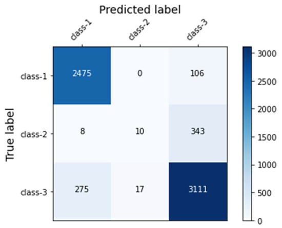 Across the models, our final model using the XGBoost classifier yielded the highest accuracy (88.20%), the highest F1 score (0.86), and the highest AUROC (0.96). Figure 2 presents the ROC curves of the model. The model gained a microaverage AUROC of 0.96 and a macroaverage AUROC of 0.90, respectively. Specifically, the AUROC of each class of the final model yielded 0.98, 0.80, and 0.93 for classes 1, 2, and 3, respectively. The confusion matrix of the final model is presented in Figure 3. In addition, we tuned a total of 138 features into the XGBoost classifier that was able to automatically compute each feature’s importance value based on its allocated contribution to the model [49]. Our final model was built with 127 features selected by the XGBoost, as listed in Table A4 of the Appendix A, in descending order of the importance values. The XGBoost automatically filtered noncontributing features.