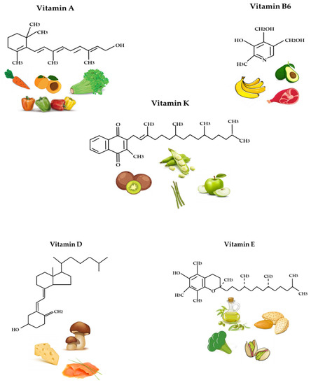 Water-soluble vitamins are not stored in our bodies and generally require daily food intake. These are the B vitamins (B1, B2, B3, B5, B6, B8, B9, B12) and vitamin C [7], differentially distributed in vegetable and animal foods, milk, and its derivatives. By comparison, fat-soluble vitamins (A, D, E, and K) are absorbed together with dietary fats; they accumulate in the liver and adipose tissue, except for vitamin K, which is poorly stored in the tissues and therefore requires a continuous dietary supply [8]. Fat-soluble vitamins are found mainly in fruit and vegetables, with the exception of vitamin D, which is synthesized by the human body. Importantly, vitamins play a fundamental role in the regulation of many chemical reactions essential for life (Table 1) [9,10,11,12,13,14].