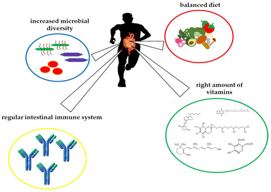 The intestinal microbiota plays a fundamental role in promoting and maintaining our health by actively influencing food metabolism, vitamin synthesis, energy production, inflammatory, and immune responses [119] (Figure 2). Moreover, factors such as age, diet, and drugs actively affect the composition of the microbiota. To these, physical exercise has recently been added with related psycho-physical stress components (specific diet, environment, performance, training) especially if practiced at a competitive level [120,121]. Following these considerations, we decided to consider vitamin’s involvement in maintenance of a healthy gut microbiota and, as a consequence, we chose to highlight the importance of gut microbiota in athlete’s performance.