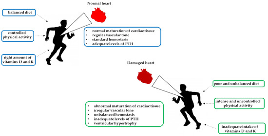 Schematic representation of hypovitaminosis effects and strenuous exercise on the heart.