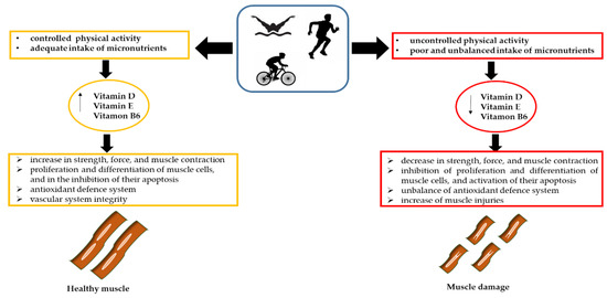 Various sports practices are characterized by intense and prolonged physical commitment; triathlons, ultra-marathons, and other high intensity and duration sports can be responsible for muscle damage (Figure 4). The extent of damage depends on several parameters, such as the degree of training, genetics, age, intensity of exertion, and state of hydration. In this context, researchers are questioning the treatments to which athletes should be prescribed [148] and the influence that the diet, in particular the administration of micronutrients such as vitamins, have on muscle damage and whether these supplements may have an influence on athletic performance (Figure 4).