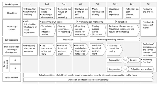 The programme process and itinerary are shown in Figure 2. This programme, implemented in 2020, comprised eight workshops. Each workshop comprised objectives, workshop content, self-recording, mini-lectures for knowledge development, biometric testing, and questionnaires. The venue was a community centre in the city, and staff from both the city administration and the research institute were involved in the operation. An overview of each workshop is provided in Appendix A.
