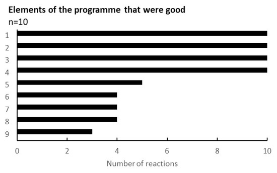 Elements of the programme that were good. The results were taken from the survey conducted during the eighth workshop. The vertical elements were as follows: 1, I could have my child taken care of safely; 2, I could have a health examination; 3, I could learn about the intestinal environment; 4, I could listen to others in a similar situation; 5, the workshop was held in my neighbourhood and it was easy to attend; 6, I could relate to the concept of ‘health & wealth’; 7, the workshop method was interesting; 8, They will listen to my stories and worries; 9, I could reconnect with previous participants.