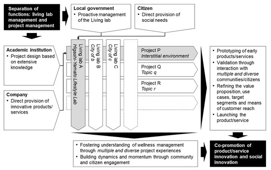Currently, there are more than 400 active projects—and more under constant development—on the subjects of social acceptance of new initiatives and social systems design in the areas of mobility [38], energy sustainability [39] and healthcare [40], and the social implementation of new technologies such as healthcare and internet of things (IoT) [41,42]. In Japan, living labs have been implemented in various environments [43,44]. These include diverse attributes, such as leader (government, academia, business, etc.), regional characteristics (urban, rural, etc.), and facility characteristics (public facility, hospital, etc. [44]. At the same time, there is a need to balance economic a societal resilience and the resolution of various types of issues, including the COVID-19 pandemic [45]. Such complexity of the environment is increasing companies’ interest in living labs and facilitating transdisciplinary developments for problem solving [46].