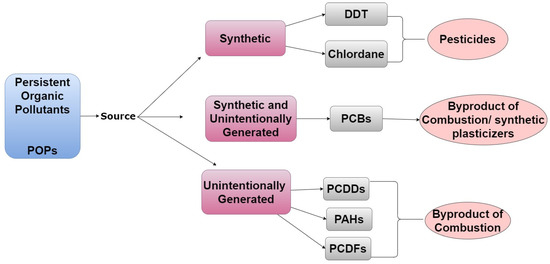 Unintentionally generated POPs include polychlorinated biphenyls (PCBs), polychlorinated dibenzo-p-dioxins (PCDDs), polycyclic aromatic hydrocarbons (PAHs), and polychlorinated dibenzofurans (PCDFs). Although PCBs were previously widely produced for commercial use, intentional manufacturing of these compounds has now been banned in most countries. Nevertheless, they are still released by some industrial processes as well as incineration of household and commercial waste [19]. From the 1950s until 1977, PCBs were synthesized to create microwave ovens, air conditioners, and electric cables [19,20]. PCDDs are byproducts of pesticide manufacture and processes utilizing chlorine bleaching. PCDDs are also produced by volcanic eruptions and forest fires. The generation of PCDFs is associated with the synthesis and incineration of products containing PCBs [21]. Lastly, PAHs are byproducts of cigarette smoke, barbecuing, and grilling [22,23].