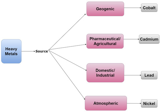 Cobalt is an example of a geogenic heavy metal, whereas cadmium and copper are considered pharmaceutical compounds [35,36]. Domestic and industrial heavy metals include lead [14] while atmospheric heavy metals include nickel and copper. Cadmium and nickel are also considered agricultural heavy metals [37].