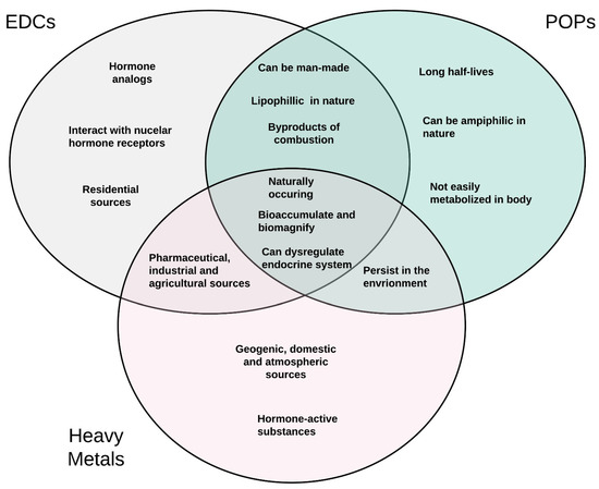 A three-way Venn diagram displaying commonalities and differences in the characteristics of POPs, EDCs, and heavy metals.