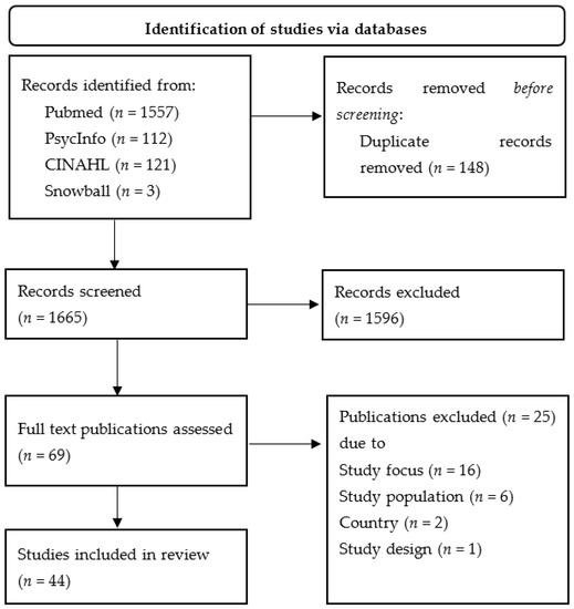 Screening was carried out by the first author only. After excluding duplicates, 1665 studies were included in the screening. After screening the titles, n = 158 were considered for further analysis. After screening the abstracts, n = 69 potentially relevant studies were identified, of which n = 44 were included in the present review after reading the full text (cf. Figure 1).