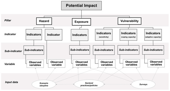 - Pillar level: Based on the IPCC climate risk concept [18], the potential impact is a multiplication result of hazard, exposure, and vulnerability pillars. Therefore, the absence of one pillar or being assigned as 0 in one of the terms meant no potential impact occurred. To this connection, the geometric (multiplicative) aggregation method is executed for this non-compensability relationship among the pillars. In this regard, the possibility of potential impact value derived from the set of the composite indicators must be present in absolute terms between 0 to 1. A value of 0 means no potential impact, and 1 is the possible worst potential impact.