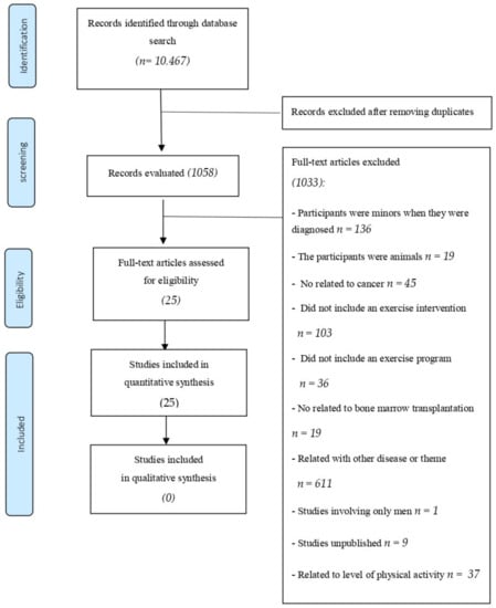 Published pilot studies were included. Unpublished clinical trials registered in clinicaltrials.gov that provided results, grey literature (e.g., abstracts, conference proceedings, and editorials), and reviews were excluded. A difference was made between exercise programs pre- and post-HSCT in cancer patients. All the selected studies met the following inclusion criteria: (a) published in English; (b) randomized controlled trials (RCTs); (c) adult patients (age ≥18 years old) of both sexes who suffered or had suffered from any type of cancer at the time of the study; (d) patients in the process of receiving or who had received an HSCT; and (e) patients who had undergone an exercise program intervention. The studies exclusion criteria were: (a) participants under 18 years of age; (b) participants were not humans; (c) patients not related to cancer; (d) studies that did not include an exercise program; (e) studies related with other diseases or themes. The selection of the studies was realized by two authors independently (E.M.R and J.L.C.), and disagreements were resolved through discussion with a third author (T.P.B.).