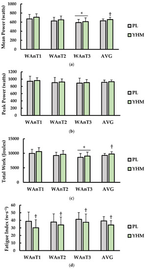 Furthermore, there was no interaction for treatment × test (p = 0.966; η2 < 0.001). For total work (joules; Figure 1c), there was a significant main effect for treatment (p < 0.001; η2 = 0.030) and test (p = 0.005; η2 = 0.030). No interaction of treatment × time (p < 0.001; η2 = 0.030) for total work was observed. YHM ingestion resulted in significantly higher AVG total work versus PL (p < 0.001; d= 0.64). Total work was higher in WAnT3 compared to WAnT1 regardless of condition. Fatigue index (watts·s−1), which represents the (peak power-minimum power)/duration of test, is presented in (Figure 1d). There was a significant main effect for treatment (p < 0.001; η2 = 0.054) but not test (p = 0.394; η2 = 0.032). There was an interaction between treatment × test (p = 0.007; η2 = 0.009). YHM ingestion resulted in a lower AVG fatigue index versus PL (p < 0.001; 1.08). Furthermore, YHM ingestion resulted in a lower fatigue index during WAnT1 (p < 0.001; η2 = 0.075), WAnT2 (p = 0.025; d = 0.36), and WAnT3 (p = 0.020; d = 0.39) compared to PL.