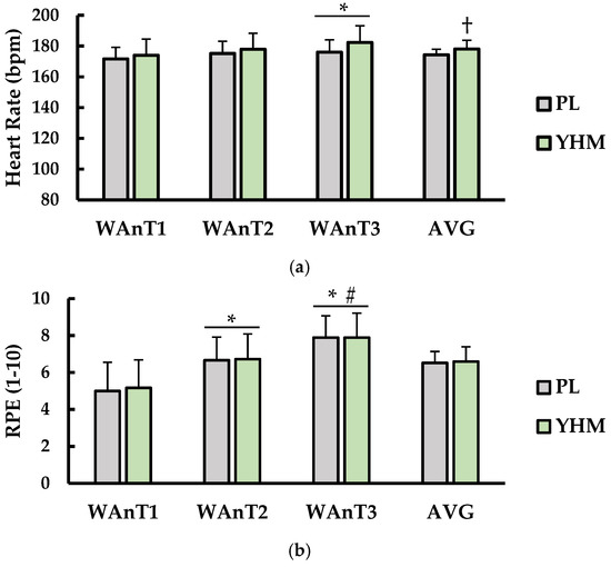 Figure 2. (a) Heart rate (HR; bpm) and (b) rate of perceived exertion (RPE; 1–10) compared between placebo (PL; grey bars) and yohimbine (YHM; green bars). Data are shown as the mean ± SD. Measurements are shown for WAnT1, WAnT2, WAnT3, and the average of all three tests together (AVG) for each condition. * indicates significantly different from WAnT1 (p < 0.05). # indicates significantly different from WAnT2 (p < 0.05). † indicates significantly different from PL (p < 0.05).