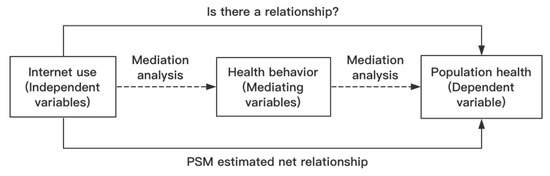 This study aimed to (1) explore whether a relationship exists between Internet use and population health; (2) determine the direction of the relationship, if there is any; (3) analyze the differences in Internet use on the health of those engaged in agriculture and those not engaged in agriculture and those with a high school-level of education or less and those with college-level or higher education; and (4) validate the mediating effect of health behavior between Internet use and population health.