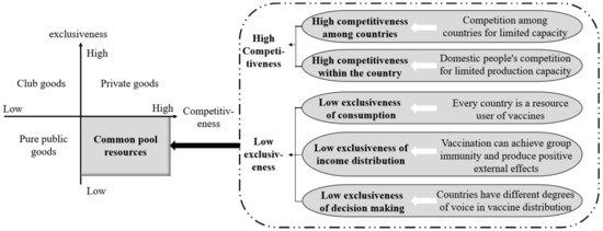 Common pool resources possess low exclusiveness of resource systems and high competitiveness of resource units [25]. Under the open supply strategy, all countries and individuals distributed over the world are consumers of COVID-19 vaccines; thus, low exclusiveness is manifested at the boundary of resource systems. Because of the extreme scarcity of COVID-19 vaccines in the foreseeable future, the competition for limited resource units will become very intense (Figure 1).