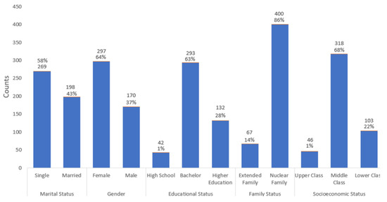 The questionnaire population consisted of Jordanian people from different social strata above 18. We received 467 responses distributed as follows: 297 (64%) responses from females and 170 (36%) from males. The population age was between 18 and 103 years old and the mean was 33.9 years (SD 13.1). The mean of the respondents’ height was 168.2 cm (SD 9.4). In addition, the mean for the respondents’ weight was 73.4 kg (SD 18.3). A total of four hundred respondents (86%) lived within a small family formed by mother and father and their children only, called the nuclear family. The other 67 (14%) respondents lived as an extended family consisting of grandparents, uncles, parents, and children.