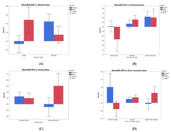 (A) Summary of BMI difference values for the respondents regarding Marital Status by gender, (B) Summary of BMI difference values for the respondents regarding educational status by gender, (C) Summary of BMI difference values for the respondents regarding family status by gender, (D) Summary of BMI difference values for the respondents regarding socio-economic Status by gender.
